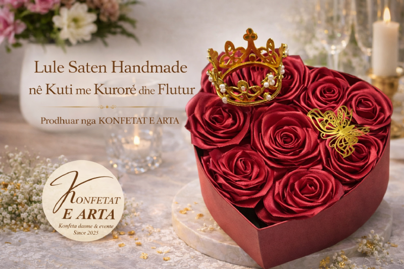 Lule Saten Handmade në Kuti me Kurorë dhe Flutur nga KONFETAT E ARTA, kuti me lule saten handmade, dhuratë me lule saten, lule artificiale saten, dhuratë romantike, dekor me lule në kuti, dhuratë e personalizuar me lule dekorative